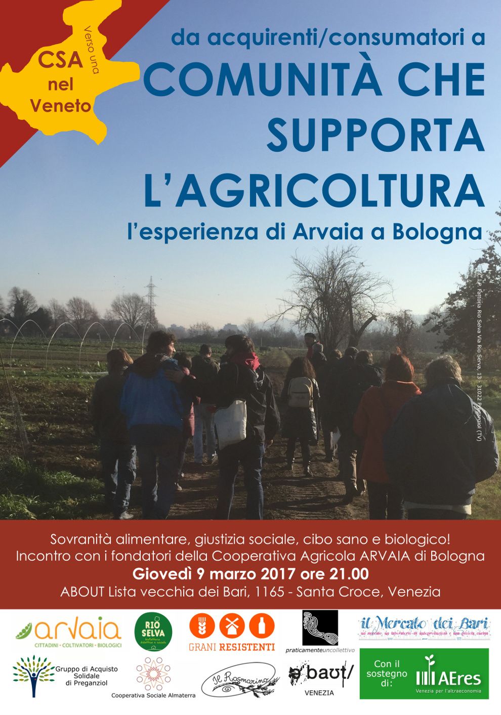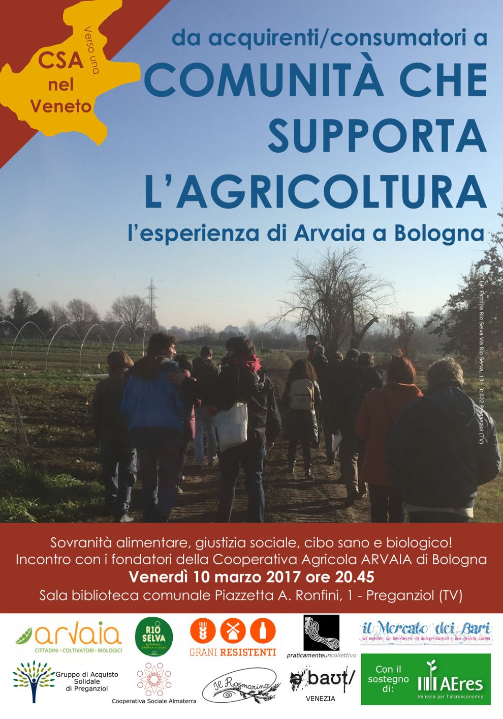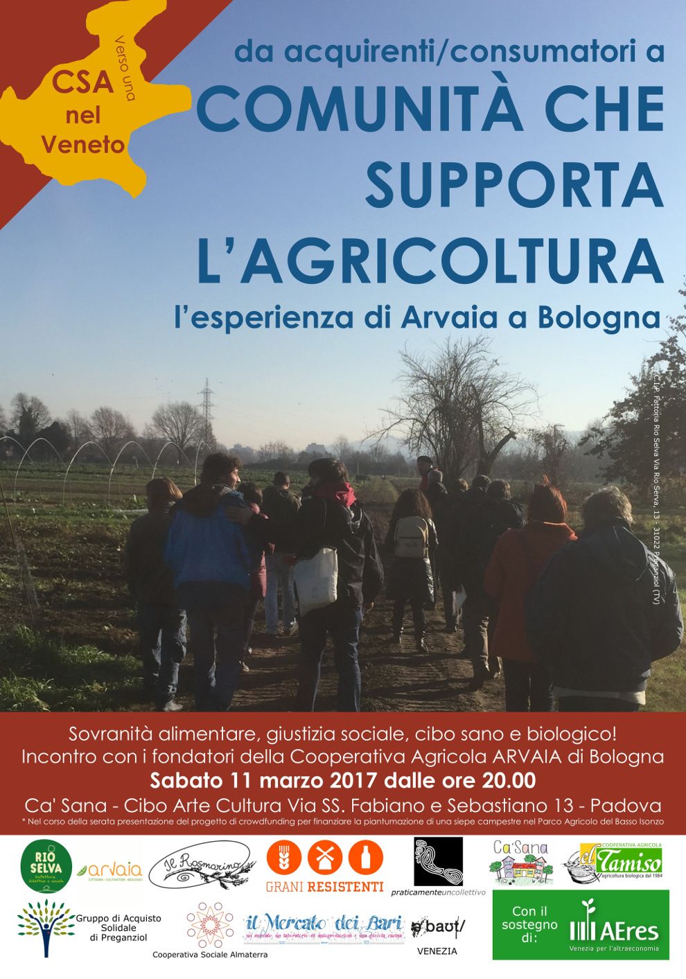Dopo la gita di un gruppo di organizzazioni venete ad Arvaia a Bologna nel dicembre 2016 per conoscere il sistema CSA, ora Arvaia rende la visita con un tour in Veneto dal 9 all'11 marzo 2017 per sostenere il percorso verso la creazione di una CSA.
