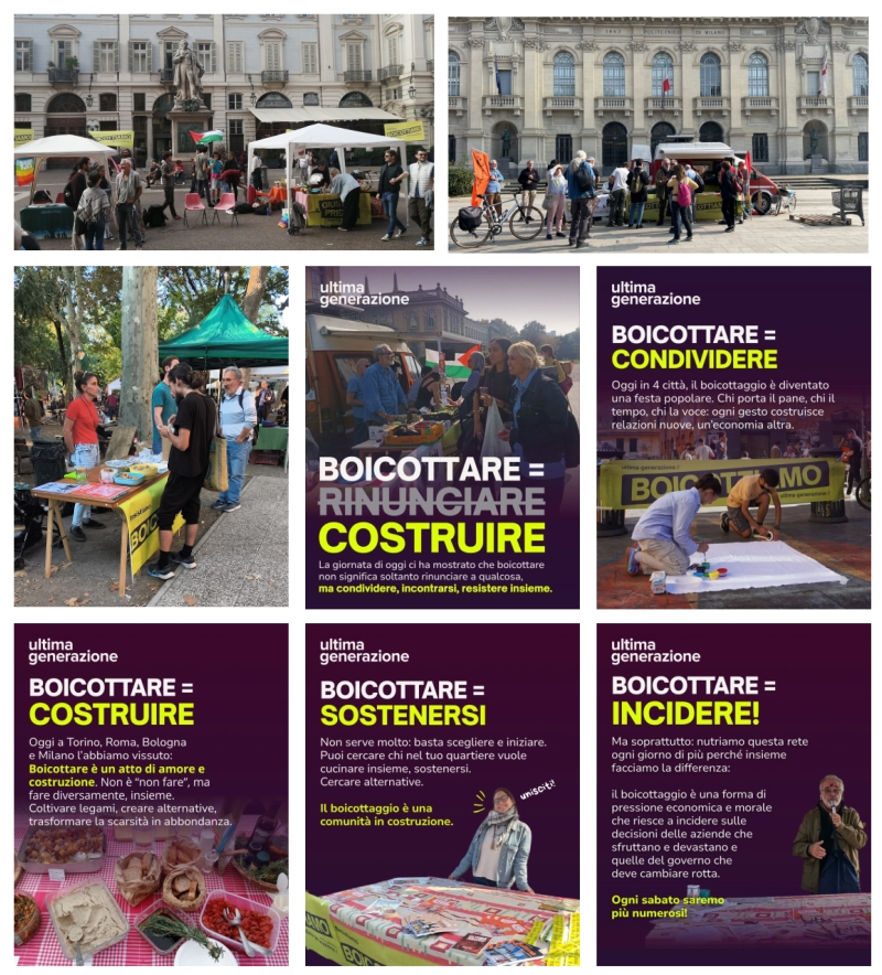 Sabato 11 ottobre 2025 a Torino, Milano, Bologna e Roma diversi soggetti dell'economia solidale hanno partecipato ai banchetti informativi per lanciare la campagna di boicottaggio alla grande distribuzione di Ultima Generazione.