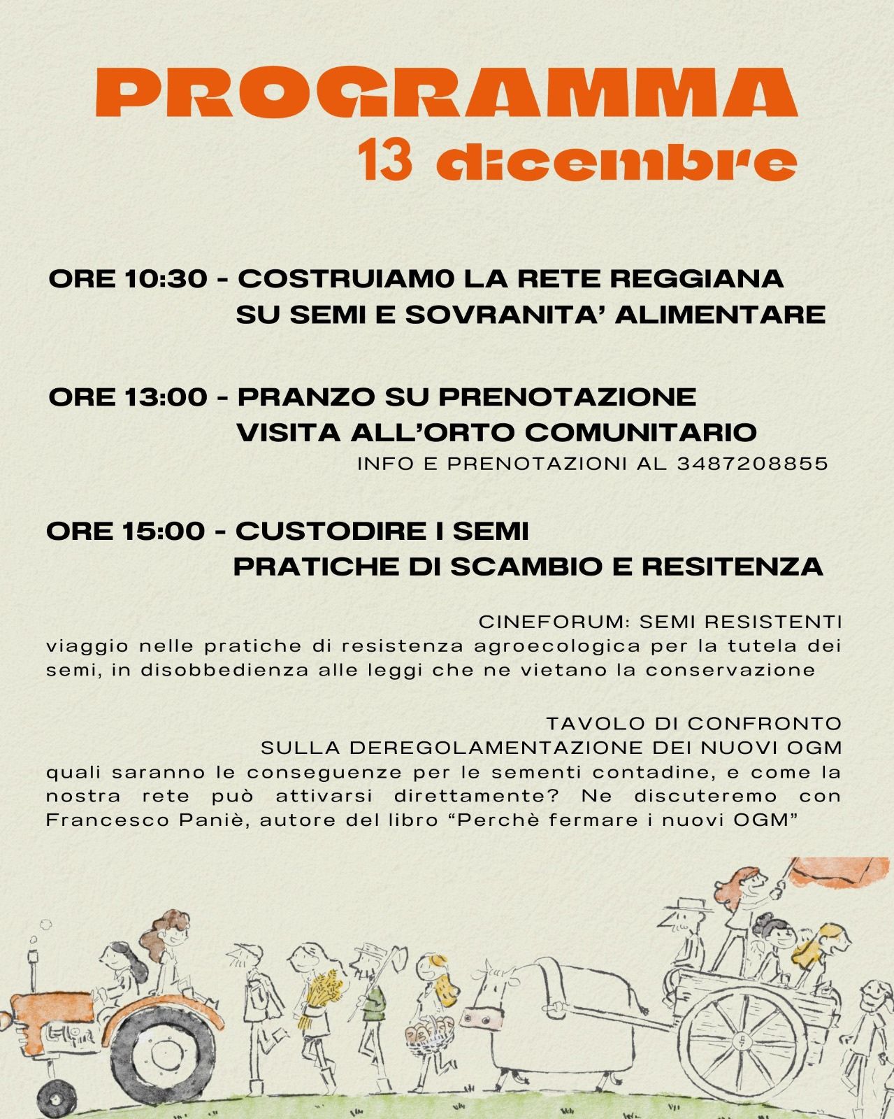 Nel pomeriggio infine, partendo dalla visione del video Semi Resistenti, apriremo un confronto su pratiche di scambio e resistenza per la difesa delle sementi contadine e della biodiversitĂ agricola dalla deregolamentazione dei nuovi OGM.