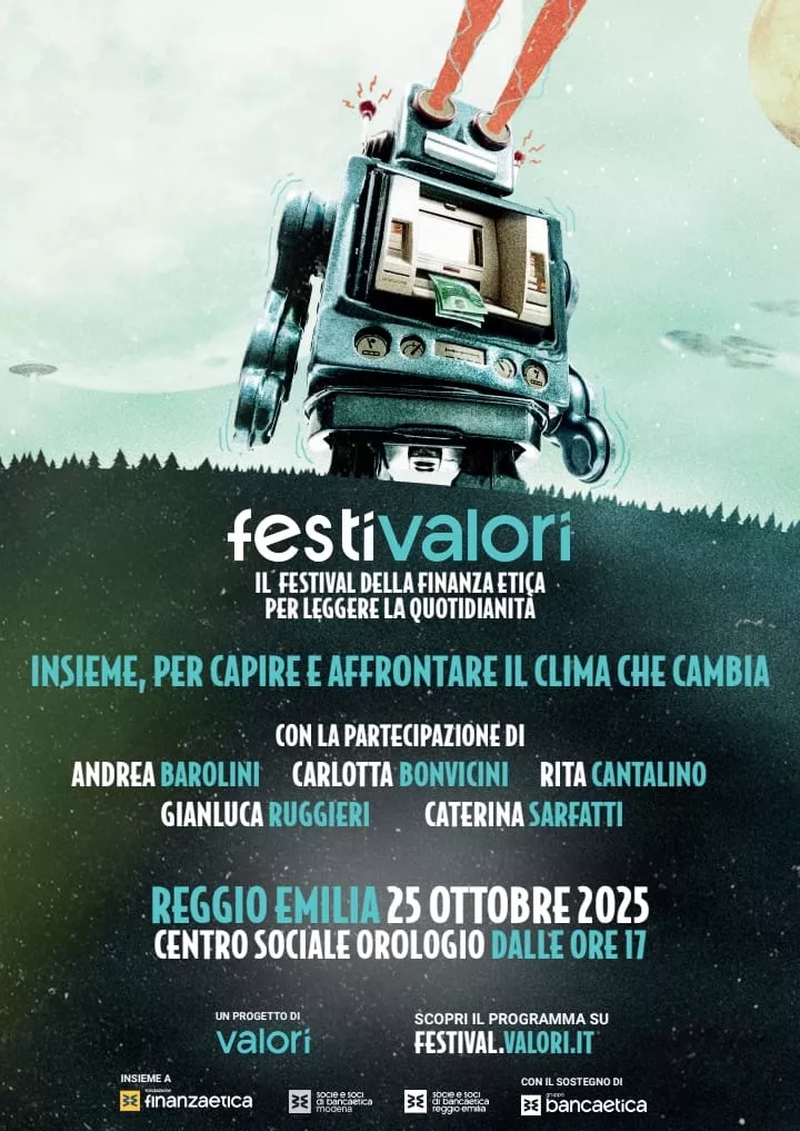 Vi invitiamo all’iniziativa organizzata dai GIT di Banca Etica di Reggio Emilia e Modena insieme a FestiValori che si terrà sabato prossimo, il 25 ottobre 2025, presso il Centro sociale Orologio, via Massenet 19 – Reggio Emilia, dalle ore 17 dal titolo