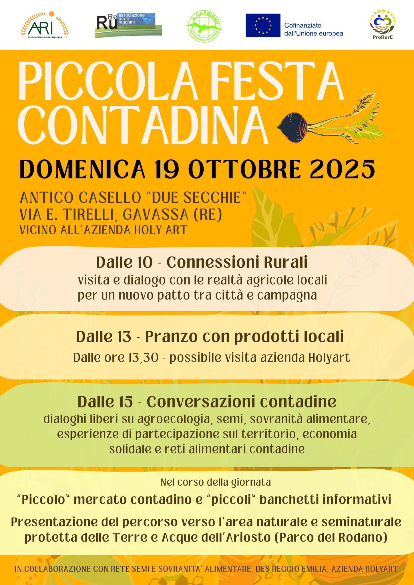 In occasione della Giornata Internazionale per la Sovranità Alimentare, i Ru.Re (Rurali Reggiani) gruppo emiliano di ARI, vi invitano a condividere una giornata speciale: la PICCOLA FESTA CONTADINA, domenica 19 ottobre 2025 dalle ore 10 alle 17 all’Antico Casello Due Secchie in via E. Tirelli a Gavassa (RE).