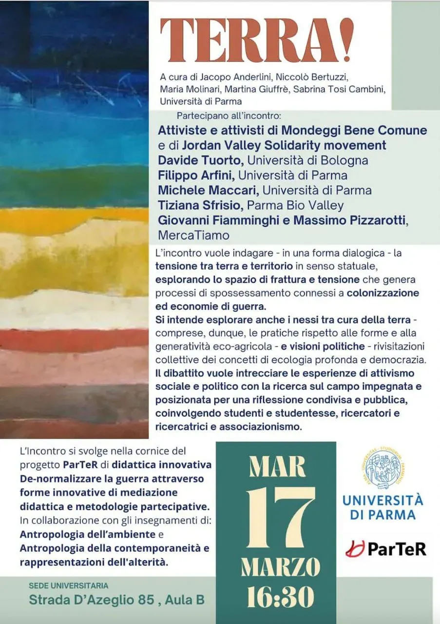 Partecipano all'incontro: Attiviste e attivisti di Mondeggi Bene Comune e di Jordan Valley Solidarity movement, Davide Tuorto Università di Bologna, Filippo Arfini Università di Parma, Michele Maccari Università di Parma, Tiziana Sfrisio Parma Bio Valley, Giovanni Fiamminghi e Massimo Pizzarotti MercaTiamo.