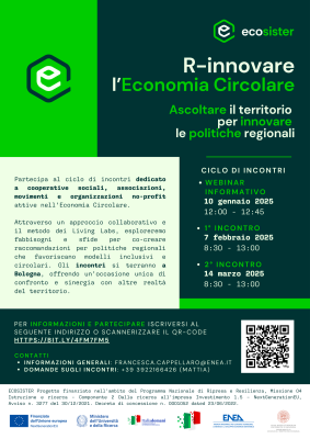Nell’ambito del progetto ECOSISTER, il Dipartimento di Sociologia e Diritto dell’Economia dell’Università di Bologna e ENEA vi invitano a partecipare al percorso “R-Innovare l’Economia Circolare: Ascoltare il Territorio per Innovare le Politiche Regionali”.